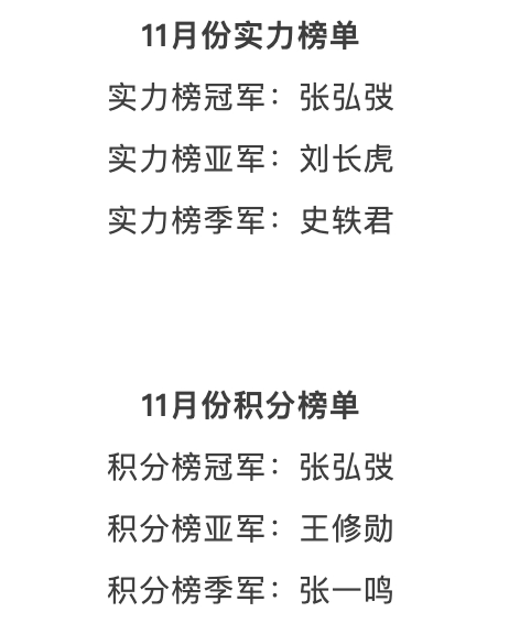 11 月 29 日,乐弈场第16届月赛如约打响!专注的目光、干脆的落子,使赛场处处迸发智力对抗的火花,一局局酣畅淋漓的较量将围棋的深邃与魅力展现得淋漓尽致。经过多轮激烈鏖战,最终张弘弢凭借沉稳心态与亮眼发挥,一举包揽月赛双榜冠军——实力与积分双摘桂冠,实至名归。